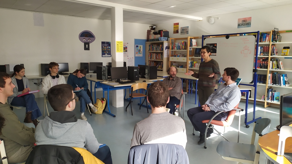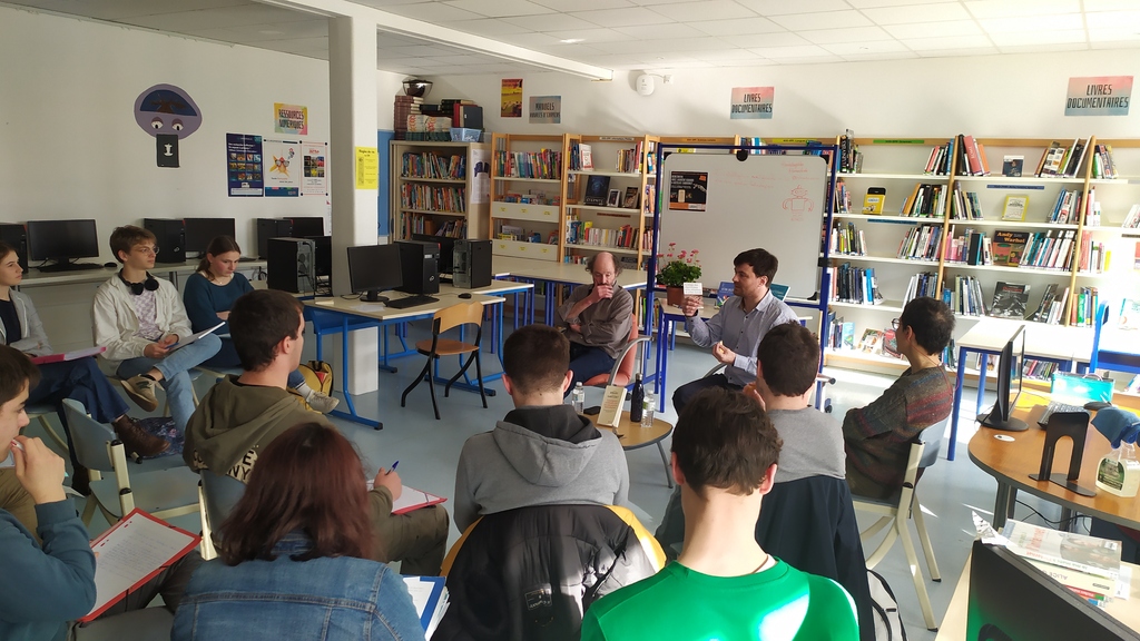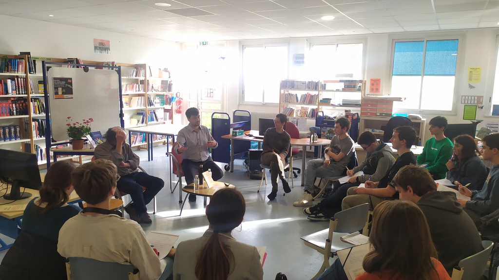 Vendredi 26 janvier, 16 élèves ont rencontré deux auteurs venus parler de leur livre "L'intelligence artificielle n'est pas une question technologique". Laurent Bibard, philosophe, et Nicolas Sabouret, informaticien, ont été reçus au CDI durant deux heures pour échanger avec les lycée.ne.s qui avaient pour la plupart lu le livre et préparé des questions.