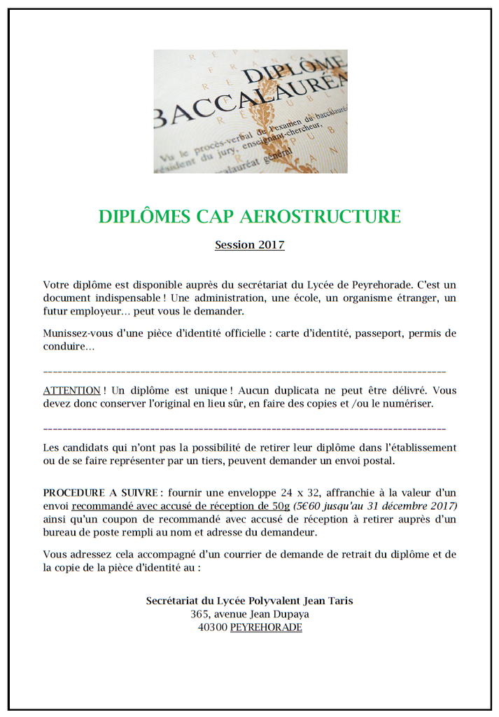 Procédure retrait des diplômes - Session 2018